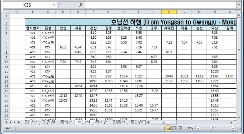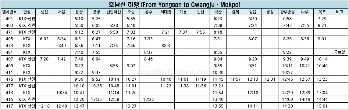 ◆ 호남선 하행 KTX열차시간표