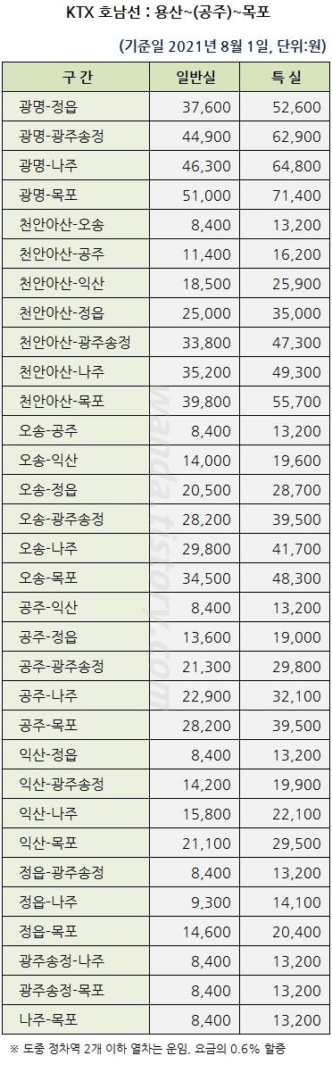 ◆ KTX 호남선 요금표
