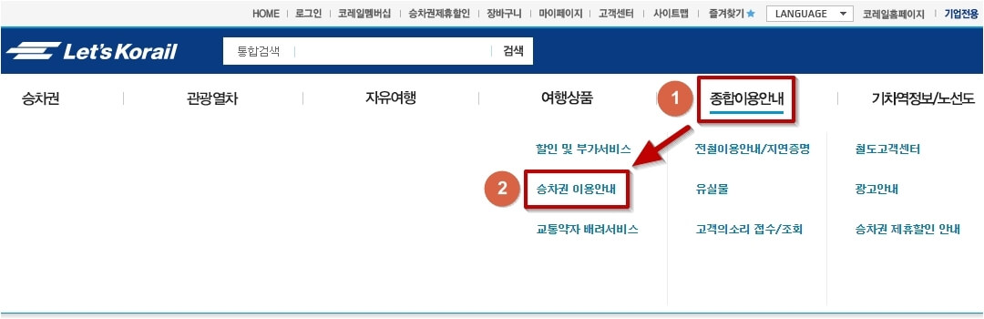 다음으로 KTX 호남선 열차시간표 및 요금표는 렛츠코레일 홈페이지에서 다운로드 받을 수 있는데요. 해당 홈페이지에 접속하여 화면 상단쯤에 있는 종합 이용안내 항목을 선택한 후 승차권 이용안내를 클릭합니다.