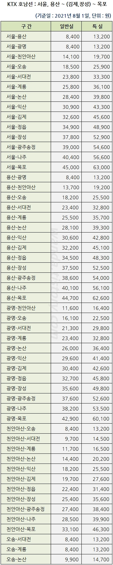 요금표는 위와 같이 공주 방향 또는 김제와 장성 방향으로 경유하는 두 가지로 나눌 수 있습니다. 공주를 거쳐가는 용산-목포 KTX 요금은 일반실 52,800원 특실 73,900원이고, 김제와 장성을 거쳐가는 용산-목포 KTX 요금은 일반실 44,700원 특실 62,600원입니다.