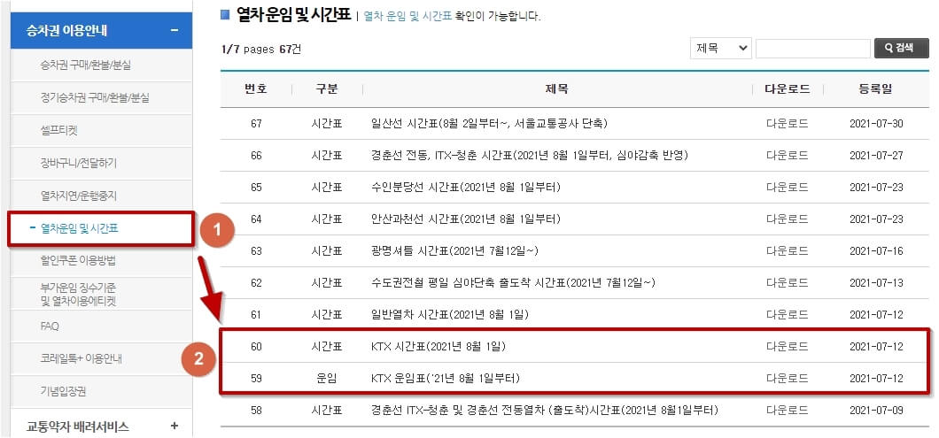관련 페이지로 넘어간 후 왼쪽 메뉴바에 있는 열차운임 및 시간표 항목을 눌러줍니다. 그러면 ktx 열차 이용시 도움 되는 시간표와 운임표를 내려받을 수 있는데요. 해당 자료는 수시로 변경될 수 있으며, 현재 기준 2021년 8월 1일부터 새롭게 적용되었습니다.